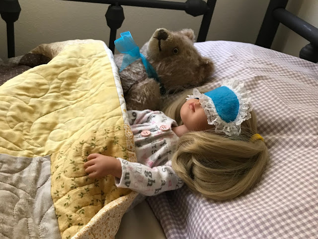 When the little girl woke up in the morning, her pillow was dry, but then she remembered her doll and began to cry again. Suddenly, through the tears, she noticed who was with her in bed. It wasn't just her bear, but Sky Blue was there, asleep next to her. Sky Blue was wearing her own pajamas and sleep mask. How did she get there?
